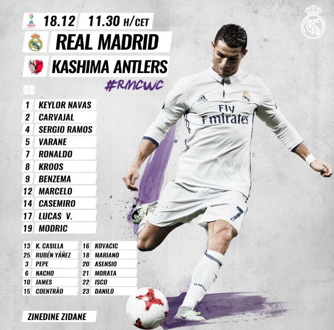 北京时间12月18日18点30分,皇马将迎来与鹿岛鹿角的世俱杯决赛,赛前皇马公布了本场比赛的首发情况,C罗、本泽马领衔球队锋线,队长拉莫斯伤愈回归,J罗、伊斯科并未进入首发,而在替补席待命。