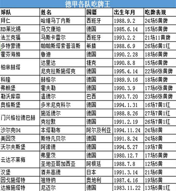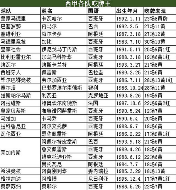 他们具有着牺牲自我保全球队的精神,红黄牌有时候也不是一味的意味着粗野,有时候也是战术价值的体现。本篇统计了五大联赛各队的吃牌王,大家来认识一下这些或许你很意外的防守悍将。