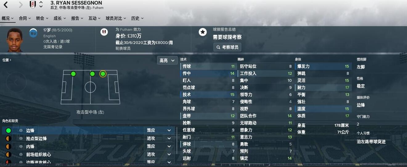 如果你认为FIFA18中的数据过于夸张。那么在另一款资深“足球狗”推崇的足球经理【**018】中,塞塞尼翁的数据也是十分“爆炸”