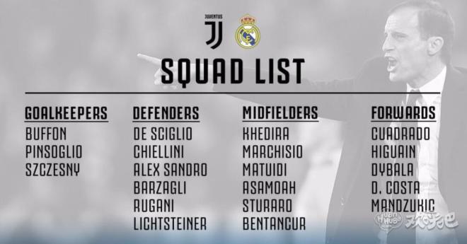 【欧冠大名单】尤文迎战皇马大名单公布,贝尔纳代斯基因伤未痊愈,没有入选大名单。桑德罗、曼朱基齐伤愈归队。皮亚尼奇、贝纳蒂亚黄牌停赛。
