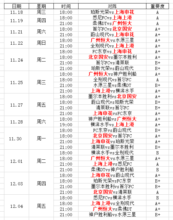 从11月18日珀斯光荣vs上海申花到12月4日神户胜利船vs水原三星的比赛为止,中超球队一共有23场亚冠比赛,比赛时间、对阵球队和重要程度如下表所示。