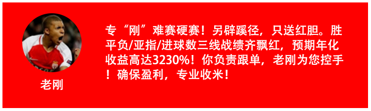 买就返100元!【老刚】专“刚”难赛硬赛!另辟蹊径,只送红胆。胜平负/亚指/进球数三线战绩齐飘红,预期年化收益高达3230%!你负责跟单,老刚为您控手!确保盈利,专业收米!快订阅试试,免费畅看老刚整月推荐还包发单推送!保您订了还想订,收了还想收!
