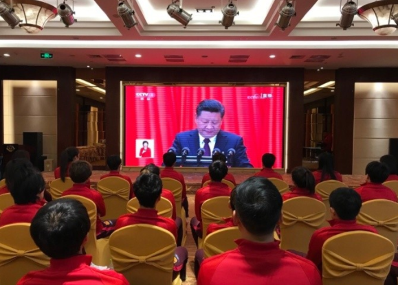 北京时间2017年10月18日,中国**第十九次全国代表大会在人民大会堂召开,中国女足的队员们集体观看了直播并进行了学习,女足队员任桂辛在微博中说道:“不忘初心,牢记使命。”