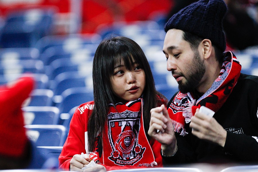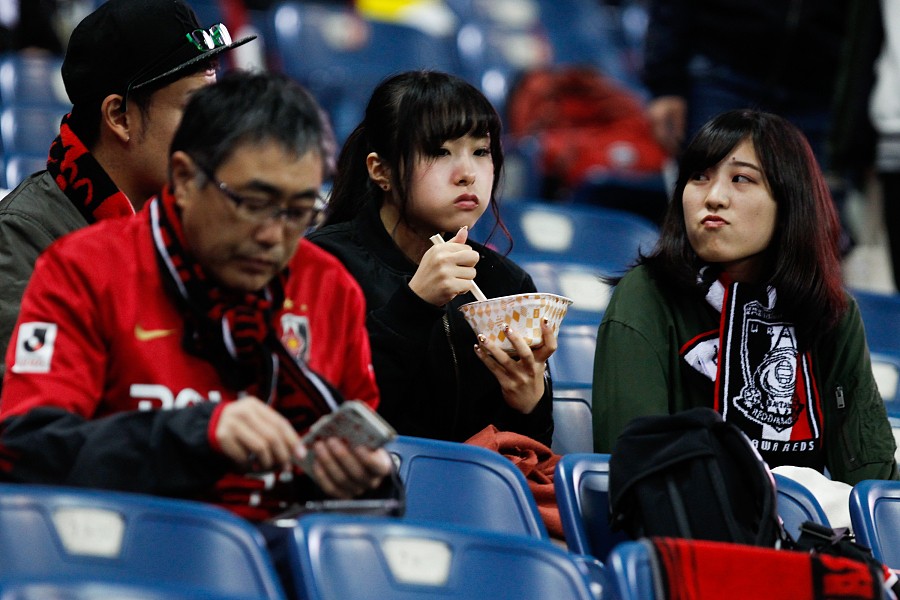 北京时间10月18日,亚冠联赛半决赛次回合浦和红钻主场迎战上海上港的比赛即将打响,浦和红钻球迷为主队加油助威。