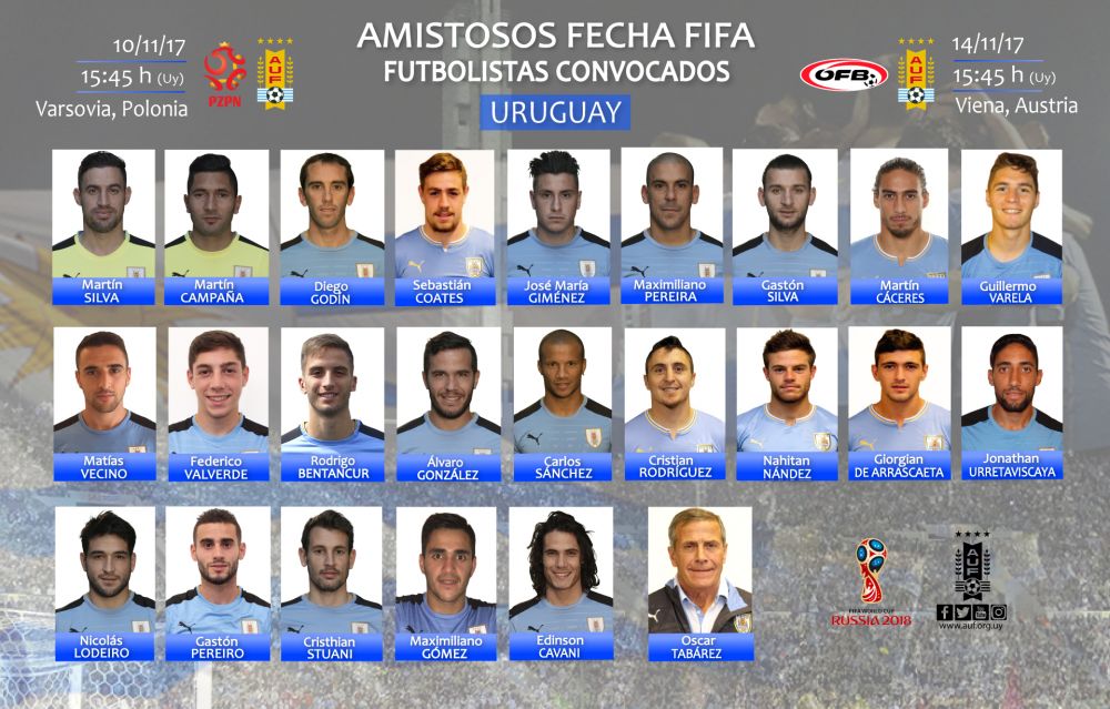 乌拉圭国家队即将与波兰及奥地利进行两场热身赛,目前球队的大名单已经公布,巴萨前锋苏亚雷斯伤缺。