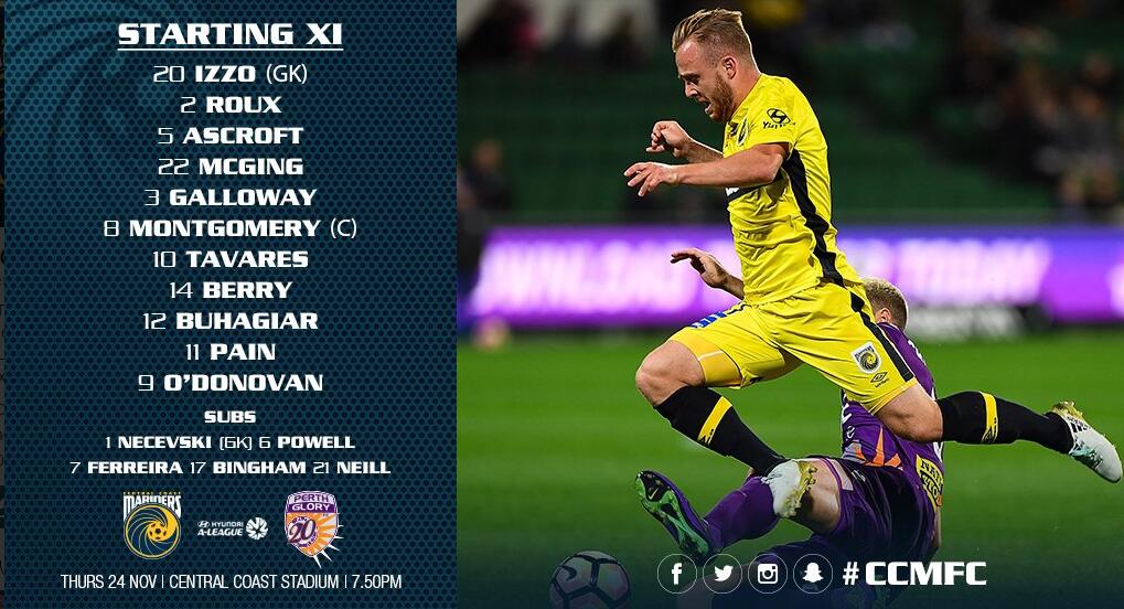 本场比赛中央海岸水手两名后卫均因伤休战,分别是波斯科列罗(2场)和法蒂(6场),中场小将罗斯(4场)上轮联赛拿到红牌,本轮将停赛缺席。他们在首发中作出了3处改变,其中3号加洛韦、12号布哈加尔和14号贝里在上轮都没有首发。