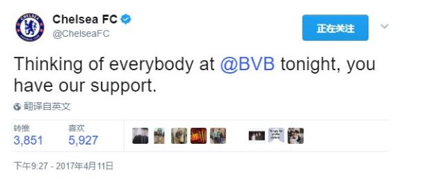 切尔西官推:我们的支持与今晚多特蒙德的每个人同在。