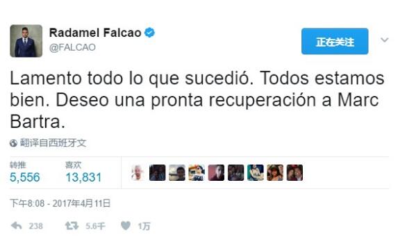 老虎法尔考:我为发生的一切感到遗憾,我们一切都好,希望巴尔特拉早日康复。