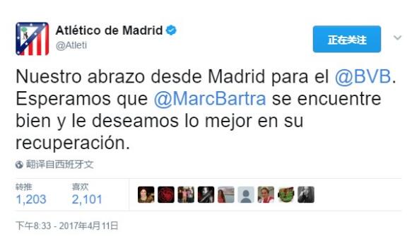 马竞官推:一个来自马德里的抱抱,希望巴尔特拉安好并祝愿他早日康复。
